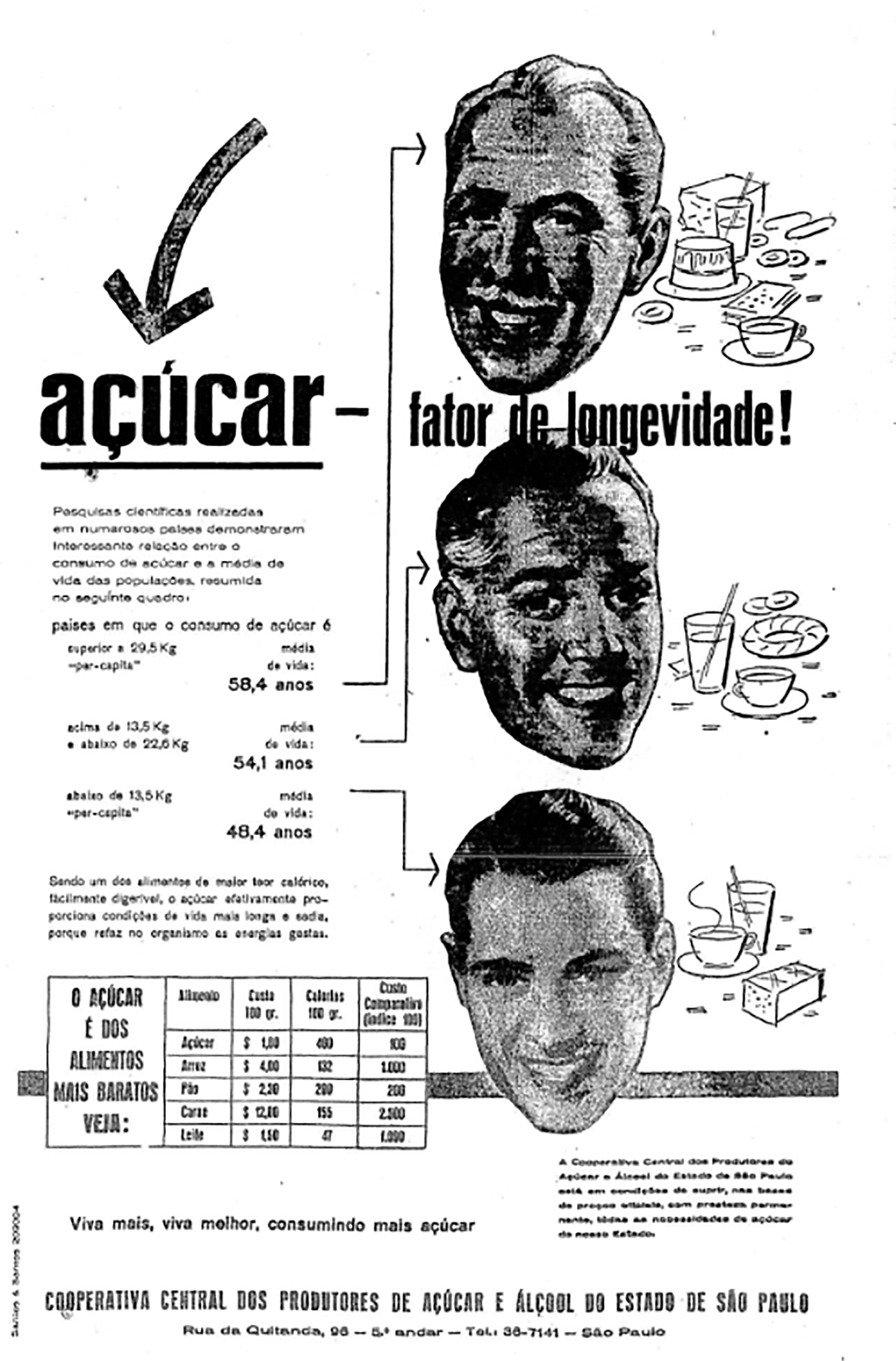 Nos anos 1960, um anúncio em jornais brasileiros chamava o açúcar de “fator de longevidade”, prometendo até 5,4 anos a mais de vida para quem consumisse 50g ou mais por dia, com tabelas comparando países. Atraía os consumidores informando ser mais barato que os demais alimentos nas refeições diárias. Publicado pela Cooperativa Central dos Produtores de Açúcar e Álcool de São Paulo, ele escondia sinais científicos da época: estudos com ratos já ligavam dietas açucaradas a hiperglicemia, triglicerídeos altos e riscos de câncer – financiados pela própria indústria, mas ocultados para proteger vendas. Essa propaganda usava correlações falsas: populações de países ricos viviam mais porque dispunham de saneamento e melhor renda, não porque comiam mais açúcar.